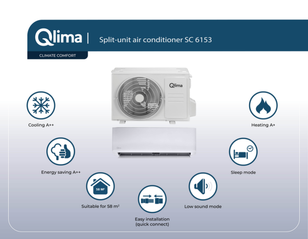 Nooit meer afhankelijk van ons grillige Nederlandse weer en temperatuurschommelingen: klimaatsysteem Qlima SC 6153 zorgt het hele jaar dat je thuis altijd een comfortabel binnenklimaat hebt. Niet te warm, niet te koud. De lucht niet te vochtig, en gefilterd van zwevende stofjes. Van deze split airco heb je het hele jaar door plezier: ‘s zomers is er verkoeling, ’s winters is het de ideale manier om de ruimte energiezuinig bij te verwarmen. Daar hoor je trouwens bijna niks van, want deze split airco is stiller dan de meeste soortgenoten. Het klimaatsysteem werkt ook als luchtontvochtiger en -reiniger. Makkelijk installerenDe Qlima SC 6153 is een split-unit airconditioning: één deel hangt binnen op een vaste plek aan de muur, het andere deel buiten. Installeren kun je als handige Doe-het-zelver voor het grootste deel zelf, dankzij voorgemonteerde leidingen van 4 meter en een lekvrije snelkoppeling. Dat is mooi besparen op installatiekosten. Alleen voor de laatste stap - het koppelen van de koelleidingen - komt een installateur van Heijmans langs. Dit is wettelijk verplicht en gewoon inbegrepen bij je aankoop.